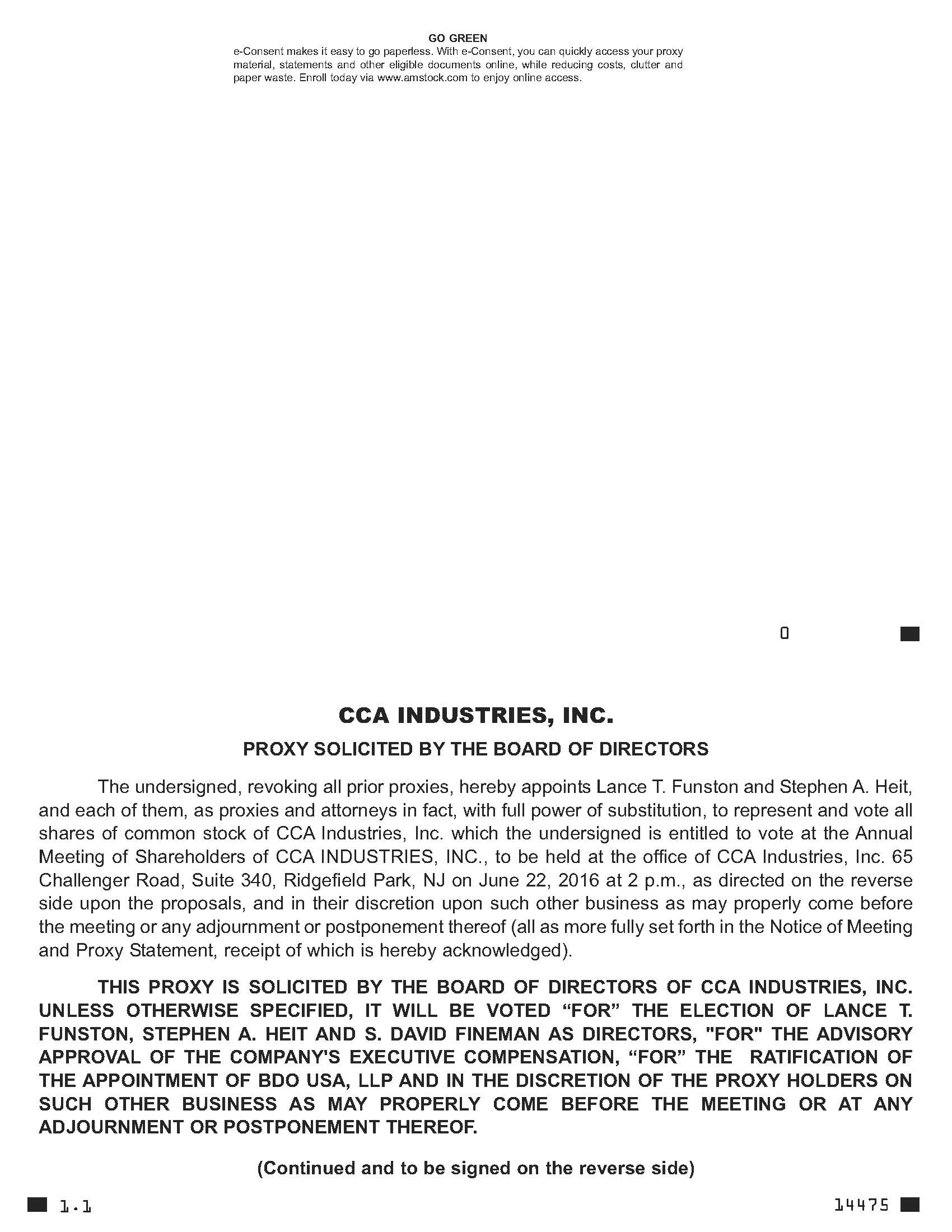 The enclosed proxy is solicited on behalf of the Board of Directors of CCA INDUSTRIES, INC., a Delaware corporation (hereinafter, the “Company”), for use at its Annual Meeting of Shareholders to be held on June 22, 2016, at 2:00 p.m Eastern Daylight Savings Time ("EDST"), at the Company’s principal executive offices, 65 Challenger Rd, Suite 340, Ridgefield Park, New Jersey 07660 (hereinafter the “Annual Meeting”). Shareholders of record on May 12, 2016 will be entitled to vote. The Company has made the proxy materials available to the shareholders of record at www.ccaindustries.com/2016 beginning on May 18, 2016 and the proxy materials are being mailed to the shareholders on or about May 18, 2016.