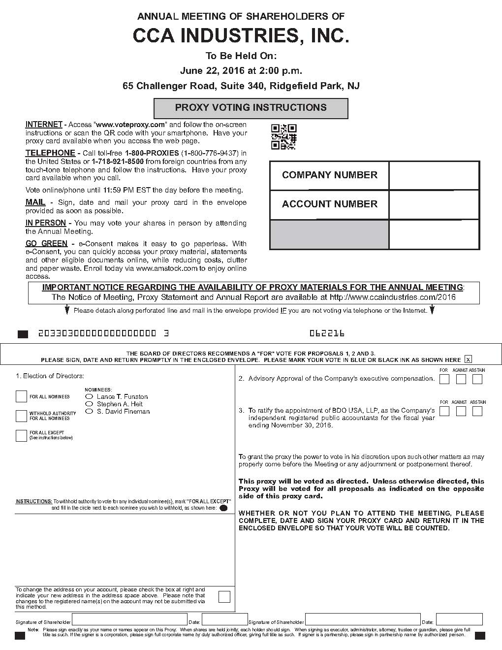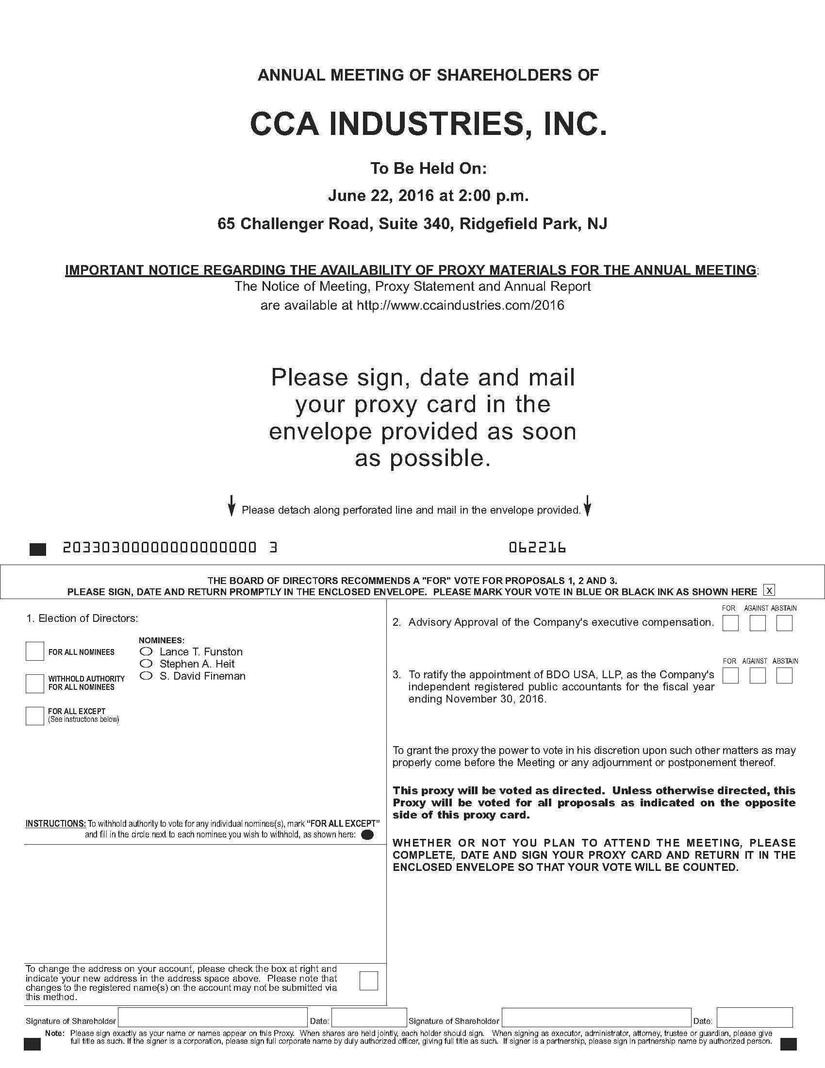 NOTICE IS HEREBY GIVEN that the Annual Meeting of the Shareholders of CCA INDUSTRIES, INC., a Delaware corporation (hereinafter, the “Company” or "CCA") will be held on June 22, 2016, at 2:00 p.m Eastern Daylight Savings Time, at the offices of the Company, 65 Challenger Road, Ridgefield Park, New Jersey 07660, for the following purposes: