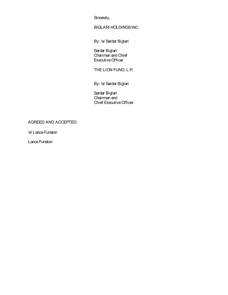 Sincerely, BIGLARI HOLDINGS INC. By: /s/ Sardar Biglari Sardar Biglari Chairman and Chief Executive Officer THE LION FUND, L.P. By: /s/ Sardar Biglari Sardar Biglari Chairman and Chief Executive Officer AGREED AND ACCEPTED: /s/ Lance Funston Lance Funston